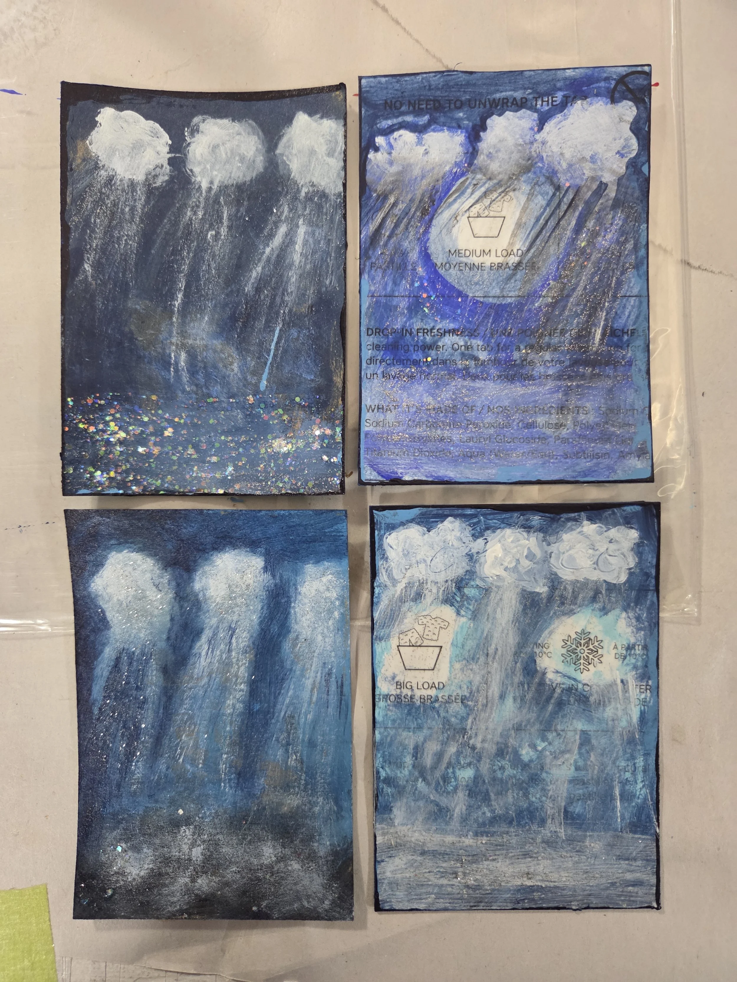 ‘snow clouds’, four art cards, recycling packaging from a laundry soap box.